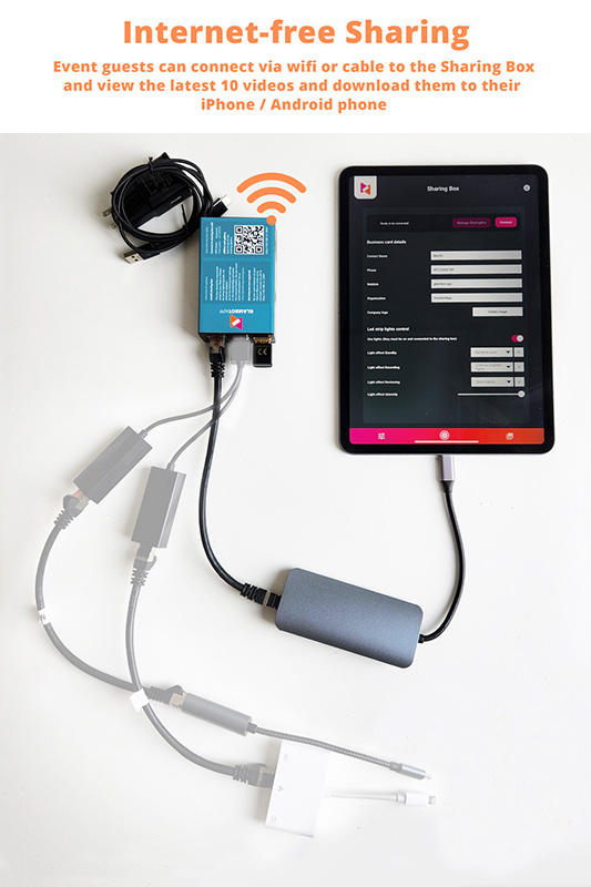 Get ready to experience unparalleled convenience with our innovative app. Connect your iPad or iPhone to this magical box using an ethernet adapter and cable, and watch the magic unfold. The sharing box emits its own local network Wi-Fi signal, enabling guests to receive videos without any internet access required.